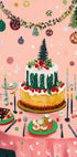 Ten kolorowy motyw bożonarodzeniowy przedstawia świąteczny stół dukatowy z dużym, pomysłowym ciastem pośrodku. Tort udekorowany jest zielonymi, białymi i czerwonymi jagodami oraz małą choinką na wierzchu. Wokół stołu znajdują się talerze wypełnione różnymi smakołykami, świecami w różnych kolorach i drobnymi detalami, które tworzą ciepłą i zabawną atmosferę. Tło jest różowe i ozdobione wiszącymi bombkami, girlandami i gwiazdami, co tworzy żywą i radosną atmosferę, oddając magię Świąt.