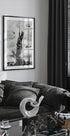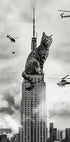 Surrealistyczna i pełna humoru grafika przedstawiająca gigantycznego kota na szczycie Empire State Building, otoczonego helikopterami w parodii inspirowanej King Kongiem. Ten czarno-biały pejzaż miejski jest idealny dla miłośników kotów i fanów zabawnych dekoracji miejskich.