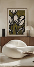 Abstrakcyjne tulipany Janel Bragg tańczą w odcieniach zieleni mchu, gdzie linie czarnego atramentu wiją się niczym eleganckie pociągnięcia nad oliwkowozielonym polem. Kompozycja równoważy mroczny romantyzm i nowoczesny Zen – energetyczny, a jednocześnie uspokajający – poetycką, botaniczną wypowiedź do salonu, sypialni lub biura. Tworzy spokój i obecność w pomieszczeniu.