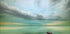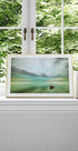 Spokojna scena z samotną łodzią pływającą cicho po wodzie pod zachmurzonym niebem. Dzięki stonowanym odcieniom zieleni i błękitu ten spokojny motyw morski przywołuje samotność, harmonię i spokojną refleksję.