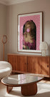 Marzycielski, inspirowany stylem vintage plakat przedstawiający młodą kobietę z różowym lizakiem i zalotnym spojrzeniem, otoczoną sercami, wstążkami i delikatnymi, kobiecymi odcieniami. Lollipop Girl autorstwa artystki Talithy McQueen równoważy słodycz i nastawienie w romantycznym, różowym wszechświecie - żywym, zabawnym i ikonicznym. Przyciąga wzrok.