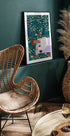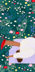 Fantazyjna i radosna ilustracja przedstawiająca kobietę leżącą na łące pełnej kolorowych kwiatów. Dzięki żywym kolorom, zabawnym detalom i poczuciu relaksu ta grafika oddaje piękno uważności, lata i marzeń w naturze.