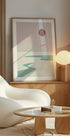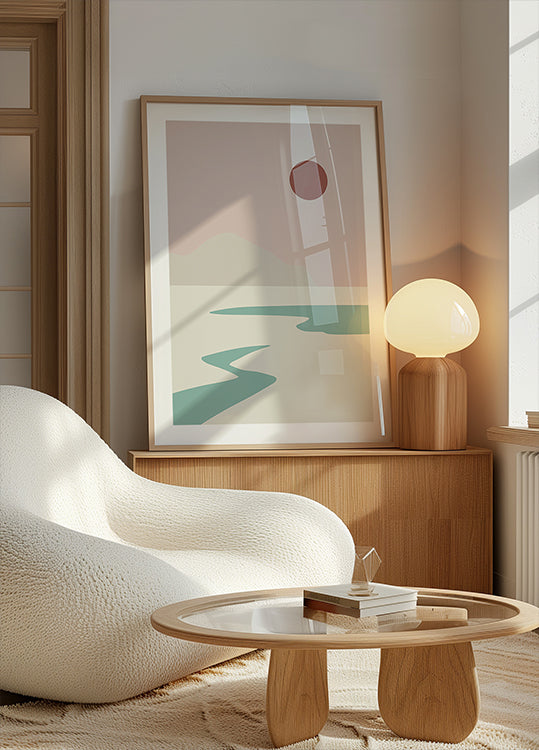 En rolig, minimalistisk daggrysscene af Little Dean: bløde, pastellyserøde nuancer breder sig over en stille sø, hvor fjerne bakker og sneklædte silhuetter tegner en ren horisont. En grafisk, nutidig landskabskomposition, der indfanger kulde, klarhed og betagende ro i ét enkelt, poetisk øjeblik. Perfekt til moderne indretning.