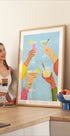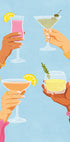 Żywa i kolorowa ilustracja celebrująca przyjaźń i radość. Cztery ręce podnoszą kieliszki koktajlowe w wesołej misce na jasnoniebieskim tle, pełnym ciepła, pozytywności i wspólnoty — idealne do nowoczesnych kuchni, barów lub salonów.