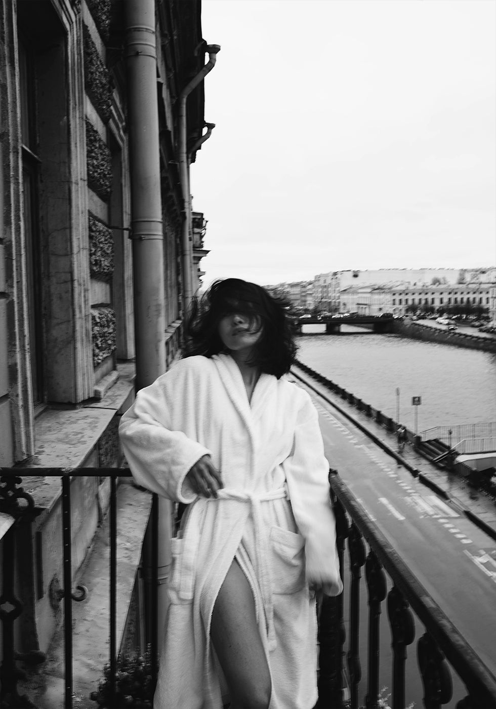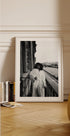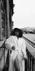 Stylowa czarno-biała fotografia, która oddaje elegancję porannej chwili na balkonie w paryskim stylu. Postać w szlafroku emanuje swobodnym stylem i intymnością, a miasto i rzeka stanowią spokojne tło. Idealna dekoracja ścienna dla miłośników mody, fotografii i ponadczasowej estetyki miejskiej.