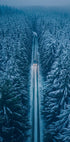Samotna zimowa droga przecina ciemny las sosnowy, spowity mgłą i niebieskawym blaskiem. Daleko przed nami reflektory samochodów przerywają ciszę i kierują wzrok ku horyzontowi, gdzie spotykają się śnieg i mgła. Ścisła symetria i melancholijny spokój oddaje tęsknotę za podróżą. Fot. Oskar Ulvur. Idealny dla miłośników spokojnych zimowych krajobrazów.
