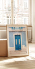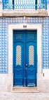 Żywa fotografia tradycyjnego portugalskiego wejścia do Lizbony, z charakterystycznymi niebieskimi kafelkami i solidnymi drewnianymi drzwiami. Grafika oddaje urok europejskiego środowiska miejskiego i podkreśla elegancję detali architektonicznych i dziedzictwa miejskiego.