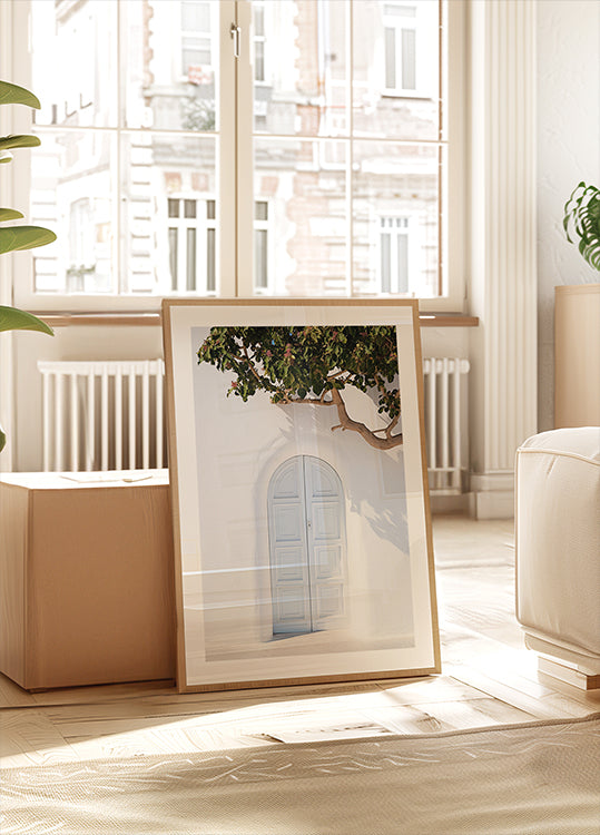 Niebieskie drzwi, plakat z architekturą śródziemnomorską