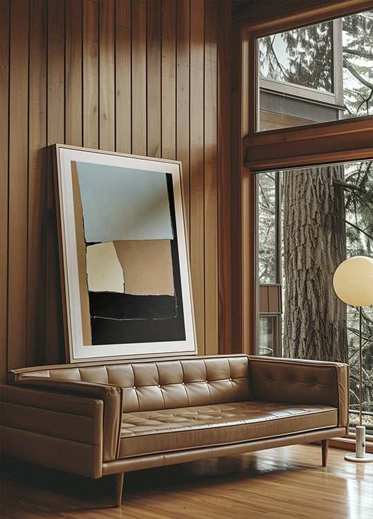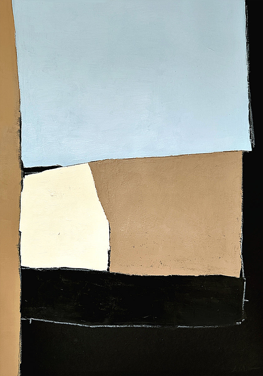 Noir series no.4 af Andrea Reichhart forener minimalisme og moderne geometri i en harmonisk komposition. Dybe sorte flader møder beige, blå og brune farvefelter, adskilt af klare linjer og dristige former. Et roligt, grafisk udtryk med raffineret kontrast, ideelt som fokuspunkt i samtidsinteriører.