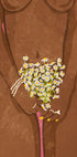 Nagi plakat Daisy Bloom to odważna, ale poetycka ilustracja, która celebruje kobiecość, miłość do siebie i naturalne piękno. Przedstawia nagą kobietę o brązowej skórze, trzymającą delikatny bukiet białych stokrotek. Praca łączy ciepłe odcienie ziemi z żywym różowym teksturowanym tłem, a szczegółowa biżuteria i świeży kwiatowy bukiet przywołują motywy siły, delikatności i zmysłowości. Mocna propozycja do nowoczesnych wnętrz, galerii sztuki czy kameralnych przestrzeni.