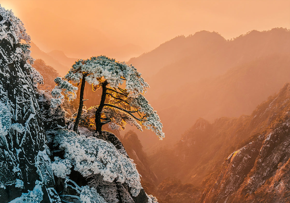 Odporność na krawędzi – Wei (David) Dai uchwycił zimowy krajobraz górski w pierwszym świetle dnia: pokryte śniegiem jodły przylegają do stromej krawędzi klifu, gdy cichy blask słońca przebija się przez horyzont. Obraz siły i spokoju, gdzie chłód, wysokość i nadzieja spotykają się w poetyckim wschodzie słońca. Idealny do marzeń o nowych szczytach.