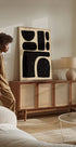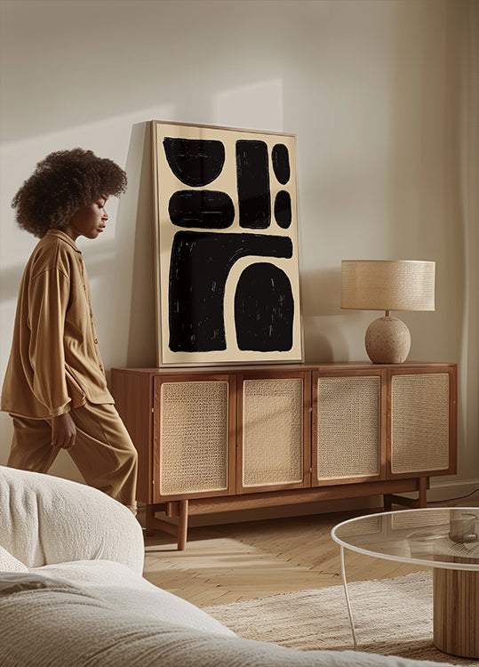 Uderzająca abstrakcyjna grafika z odważnymi czarnymi kształtami na delikatnym beżowym tle. Organiczne kształty i teksturowane pociągnięcia pędzla tworzą nowoczesną, minimalistyczną estetykę - idealną do współczesnych wnętrz, ścian galerii lub dla każdego, kto kocha czysty, ale artystyczny design.