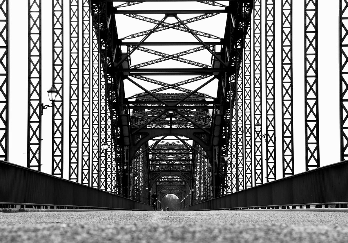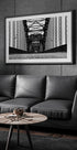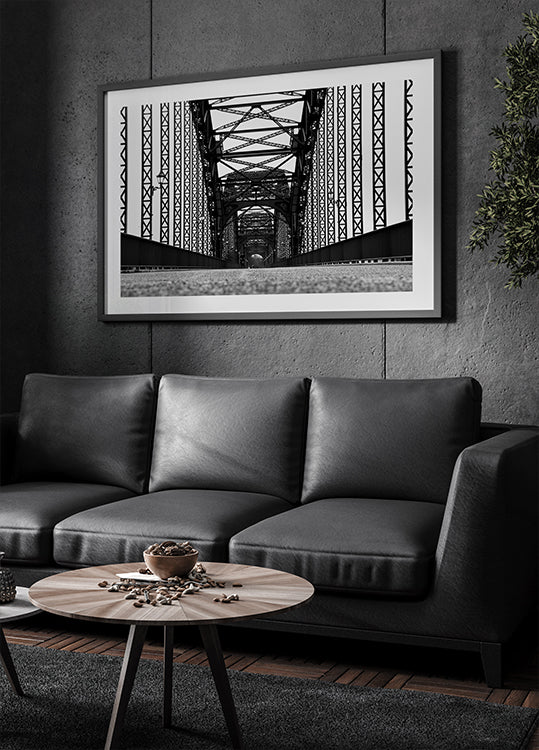 Ta uderzająca czarno-biała fotografia oddaje silną geometrię stalowej konstrukcji w Hamburgu. Powtarzające się żelazne wzory, ostre kontrasty i głęboka perspektywa tworzą odważne architektoniczne dzieło sztuki, które łączy w sobie przemysłowe piękno z ponadczasowym designem, idealne na nowoczesną i graficzną ścianę z obrazami.