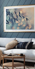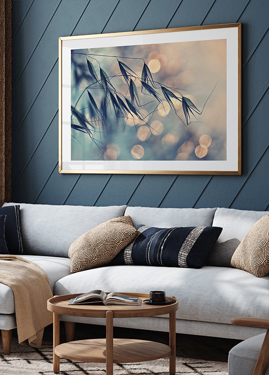 To spokojne zbliżenie ukazuje delikatne źdźbła trawy na marzycielskim pastelowym tle z delikatnym światłem bokeh. Spokojna atmosfera i delikatna elegancja tworzą kojące dzieło sztuki, które emanuje harmonią, ciszą i spokojem, idealne na relaksującą ścianę z obrazami.