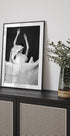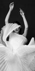 Uderzający czarno-biały portret kobiety w rzeźbionej plisowanej sukience, uchwycony w połowie ruchu. Dramatyczne fałdy i płynna tkanina tworzą poczucie rytmu i elegancji, przypominające zarówno taniec, jak i rzeźbę abstrakcyjną. Odważna, monochromatyczna grafika łącząca modę, ruch i sztukę.