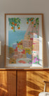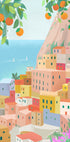 Kolorowa ilustracja Wybrzeża Amalfi, gdzie pastelowe domy spadają z klifów w stronę turkusowego morza. Praca otoczona drzewkami pomarańczowymi i kwiatami oddaje esencję włoskiego lata – słoneczną architekturę, śródziemnomorski urok oraz radość podróżowania i wakacji.
