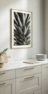 Intensywne zbliżenie ananasa oddaje rzeźbiarskie kształty korony liścia i graficzny wzór muszli w głębokich zielonych i złotych odcieniach. Ścisłe kadrowanie i miękkie oświetlenie studyjne tworzą spokojną, nowoczesną ekspresję ze świeżą tropikalną energią i zmysłową fakturą, która podnosi przestrzeń. Idealny jako spokojny akcent w kuchni lub salonie.