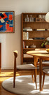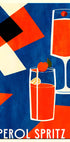 Odważny i kolorowy plakat graficzny przedstawiający kultowy koktajl Aperol Spritz, przedstawiający geometryczne kształty w żywych kolorach pomarańczowym, niebieskim, czarnym i białym. Dzięki modernistycznemu designowi i zabawnej energii grafika oddaje esencję włoskiej kultury aperitivo, idealną do kuchni, barów i przestrzeni socjalnych.