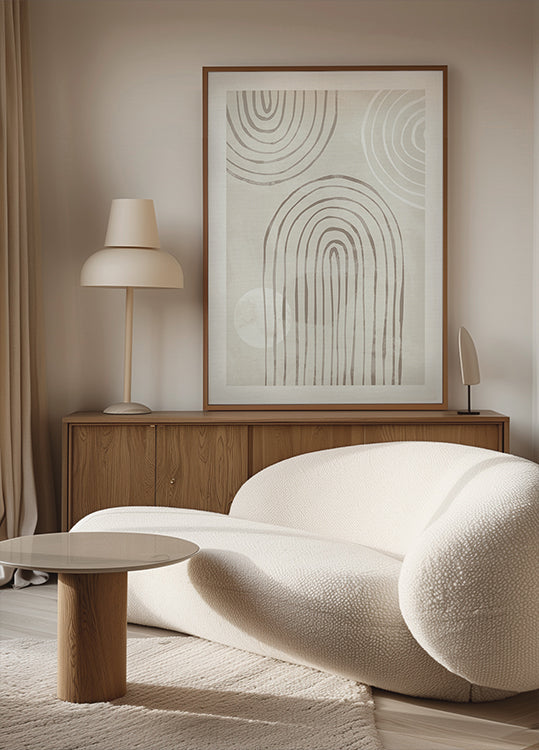 Ręcznie rysowany abstrakcyjny plakat z organicznymi zakrzywionymi liniami i okrągłymi wzorami w delikatnych beżowych odcieniach. Niedoskonała, płynna geometria dodaje ciepła i tekstury oraz nadaje grafice naturalny i artystyczny akcent. Idealny do wnętrz minimalistycznych, inspirowanych kuchnią japońską i skandynawską.