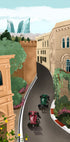 Kolorowa ilustracja samochodów Formuły 1 jadących historycznymi ulicami Baku w Azerbejdżanie. Grafika łączy w sobie urok starej architektury z nowoczesną panoramą z kultowymi Wieżami Płomienia w tle. Dynamiczne dzieło, które oddaje prędkość, kulturę i emocje towarzyszące Grand Prix Baku.