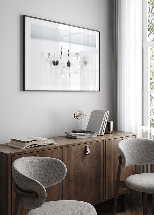 Pełen wdzięku taniec dwóch czerwonych żurawi szybuje nad pokrytym śniegiem krajobrazem, uchwycony w kaligraficznym wyrazie w jasnym świetle przez Larry'ego Denga APA. Miękkie, przypominające atrament pociągnięcia i minimalistyczna przestrzeń tworzą spokój, ruch i poezję – jak zimowy wiatr na papierze – cichy hołd dla japońskiej elegancji i rytmu natury. Poetycki wygląd Twojej przestrzeni.