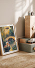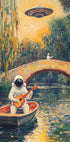 Surrealistyczny obraz w stylu impresjonistycznym przedstawiający astronautów w ziemskim krajobrazie. Astronauta siedzi w łodzi i gra na gitarze, podczas gdy inny wykonuje gesty z kamiennego mostu pod złotym niebem. Nad nimi unosi się UFO, które łączy science fiction z historią sztuki w humorystycznej i pomysłowej scenie.