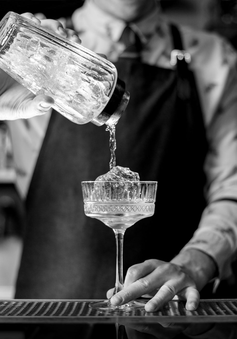 Stylowa czarno-biała fotografia przedstawiająca barmana nalewającego koktajl do klasycznego kieliszka coupe. Lód mieni się w miarę przepływu cieczy, tworząc ponadczasową scenę miksologii. Idealny do dekoracji barów, miłośników koktajli lub ceniących sztukę barmańską.