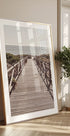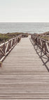 Spokojna przybrzeżna fotografia przedstawiająca drewnianą promenadę prowadzącą bezpośrednio do lśniącego morza. Perspektywa znikającego punktu zachęca widza do wędrówki w kierunku horyzontu i przywołuje poczucie spokoju, wolności i bezruchu lata.