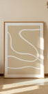 Uspokajający, minimalistyczny plakat z płynnymi białymi liniami na beżowym tle. Abstrakcyjna kompozycja emanuje prostotą, harmonią i elegancją, dzięki czemu jest ponadczasowym elementem nowoczesnych wnętrz.