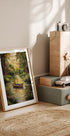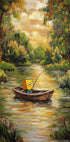 Humorystyczna parodia, która łączy w sobie klasyczny pejzaż z malarstwa olejnego z popkulturą. Scena przedstawia postać z kreskówki, która spokojnie łowi ryby w drewnianej łodzi otoczonej bujnymi drzewami i świecącą rzeką. Zabawna mieszanka natury i surrealistycznego humoru, idealna dla fanów dziwacznych obrazów ściennych.