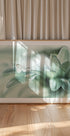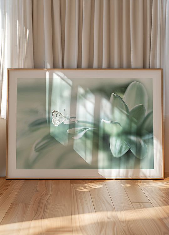 Wspaniała fotografia makro motyla delikatnie odpoczywającego obok błyszczącej kropli wody na miękkich zielonych płatkach. Dzięki pastelowym kolorom i marzycielskiemu, rozmytemu tłu, ta grafika oddaje kruchość, czystość i ciche piękno natury.