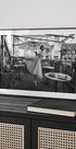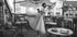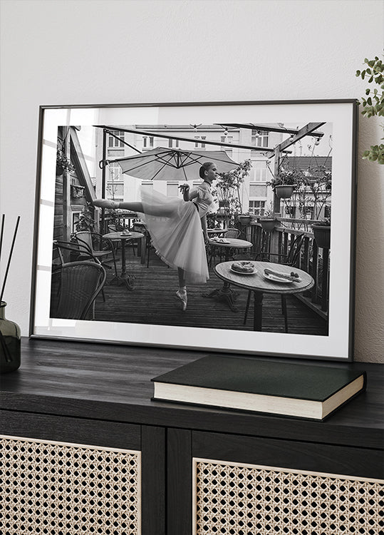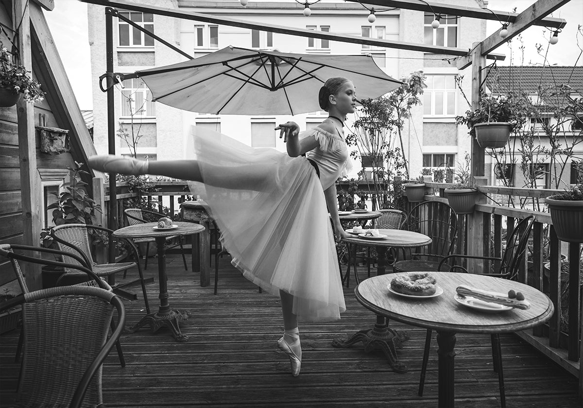 Na tym eleganckim czarno-białym zdjęciu pełna wdzięku baletnica pozuje na tarasie kawiarni. Połączenie tańca, architektury i miejskiego życia w kawiarni tworzy poetyckie i ponadczasowe dzieło sztuki.