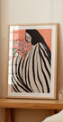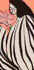 Marzycielski i poetycki plakat ze stylizowanym portretem kobiety w efektownych czarno-białych paskach, delikatnie trzymającej kwiat. Dzięki delikatnemu brzoskwiniowemu tłu i wyrazistym liniom grafika łączy w sobie romans, kobiecość i nowoczesną ilustrację w dekoracyjnym wyrazie pełnym uczuć i uroku.