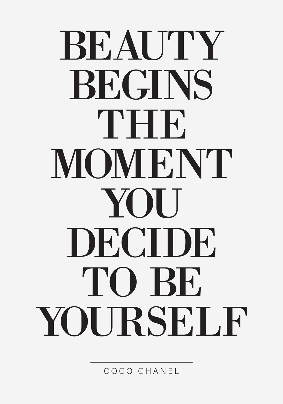Wyrafinowany i minimalistyczny projekt typograficzny z inspirującym cytatem Coco Chanel: „Piękno zaczyna się w momencie, gdy decydujesz się być sobą”. Ta elegancka czarno-biała grafika emanuje ponadczasowym stylem i pewnością siebie, idealna do inspirowanych modą wnętrz, szaf lub biur.