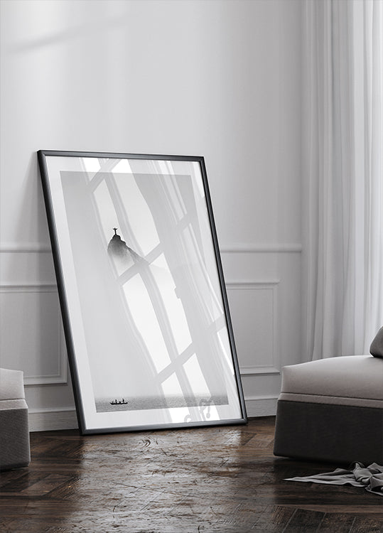 Spokojna czarno-biała fotografia przedstawiająca kultową statuę Chrystusa Odkupiciela w Rio de Janeiro, majestatycznie stojącą nad mgłą. Mglista atmosfera tworzy atmosferę duchową i kontemplacyjną, a niewielka łódka wiosłowa na wodzie podkreśla skalę i głębię sceny. Ponadczasowe dzieło łączące monumentalność ze spokojem, idealne dla miłośników fotografii religijnej, architektonicznej i minimalistycznej.