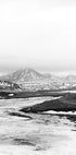 Graficzny czarno-biały krajobraz autorstwa Lynann Colligan: zamarznięta islandzka rzeka wije się przez tundrę w kierunku odległych gór pod rozległym, nieruchomym niebem. Kontrasty między pęknięciami lodu i miękkimi powierzchniami śniegu tworzą głębię i spokój, z nordyckim minimalizmem i surową zimową poezją. Ponadczasowe, monochromatyczne spojrzenie na siłę natury.