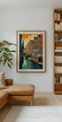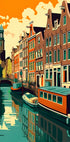 Taudalpois Amsterdam Canal Houses oddaje urok wąskich domów ze szczytami wzdłuż kanału. Ciepłe pomarańczowe odcienie odbijają się w wodzie, a łodzie i rowery sugerują spokojny ruch po zabytkowych ulicach. Nostalgiczny plakat podróżniczy o przejrzystości graficznej i nowoczesnym stylu vintage. Idealny dla miłośników Amsterdamu i nordyckiej poezji miejskiej.