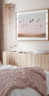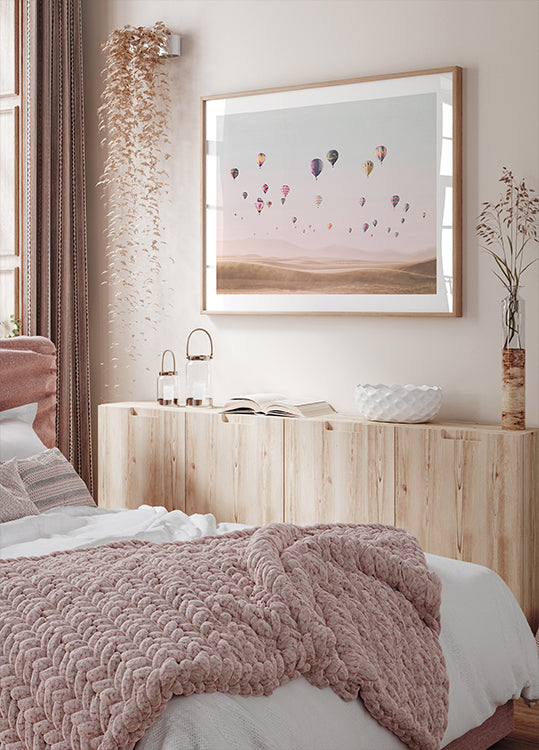 Wymarzona fotografia kolorowych balonów na ogrzane powietrze unoszących się nad złotymi wydmami pod pastelowym niebem. Grafika oddaje magię podróży, wolności i przygody, dzięki czemu jest pięknym elementem każdego wystroju inspirowanego pasją do podróży.