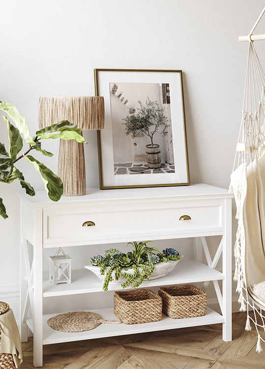 Minimalistyczne i spokojne przedstawienie rustykalnego drzewa oliwnego posadzonego na drewnianej tacy, umieszczonego na tle bielonej ściany. To dzieło sztuki podkreśla ponadczasowe piękno śródziemnomorskiego uroku i jest idealne do stworzenia relaksującej i naturalnej atmosfery.