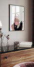Ta ilustracja, będąca zabawną, nowoczesną interpretacją klasycznej ikony, przedstawia czarującą kobietę w perłach i rękawiczkach dmuchającą gumę. Minimalistyczny styl i mocne kontrasty łączą w sobie klasyczną elegancję z bezczelnym pop-artem, idealne dla miłośników mody i nowoczesnych wnętrz.