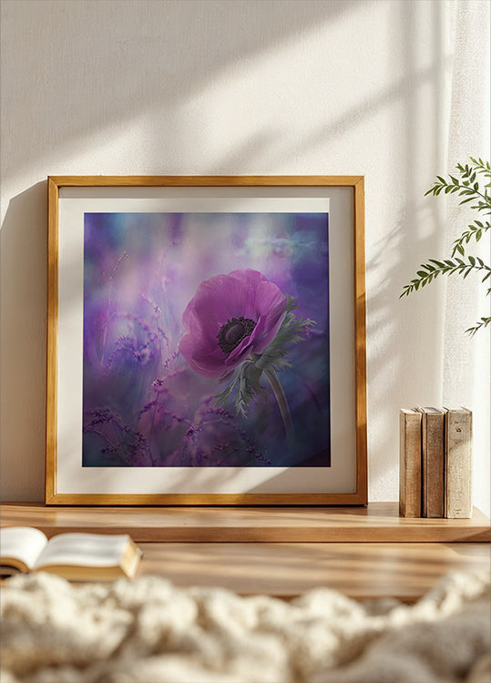 Ecstasy autorstwa Natalii Simongulashvili (NATALIORION) oddaje marzycielski moment botaniczny: delikatne fioletowe kwiaty i delikatne źdźbła trawy wyłaniają się w aksamitnym świetle, otoczone dyskretną winietą. Spokojna scena kwiatowa, która tworzy w pomieszczeniu zanurzenie, poezję i odrobinę magii ogrodu. Tworzy unoszący się w powietrzu, poetycki spokój w domu.