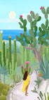 Kolorowa ilustracja śródziemnomorskiego ogrodu z bujnymi kaktusami, sukulentami i egzotycznymi roślinami z widokiem na morze. Kobieta w żółtej sukience spaceruje kamienną ścieżką, wywołując poczucie eksploracji, spokoju i naturalnego piękna. Idealny do wprowadzenia letniej atmosfery i botanicznego uroku do każdego pomieszczenia.