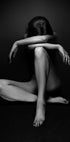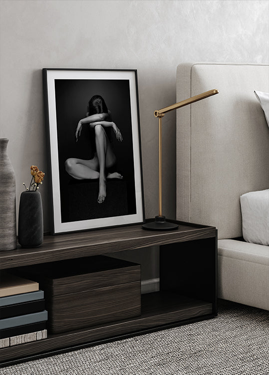 Mocna, artystyczna fotografia czarno-biała przedstawiająca siedzącą kobietę wyrażającą surowe emocje, zmysłowość i wrażliwość. Dzięki dramatycznemu oświetleniu i monochromatycznej ekspresji dzieło przywołuje motywy smutku, siły i melancholii, stając się przyciągającym wzrok figuratywnym dziełem sztuki ściennej.