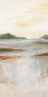 Miękki i sugestywny obraz pejzażowy ze spokojnymi pociągnięciami pędzla i stonowanymi kolorami. Ten abstrakcyjny obraz pejzażu wodnego łączy ziemię, wodę i niebo w spokojny horyzont, który wywołuje uczucie spokoju i kontemplacji. Idealne dzieło sztuki, które wprowadzi uspokajającą i inspirowaną naturą atmosferę do każdego pomieszczenia.