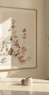 Nowoczesna grafika botaniczna przedstawiająca gałęzie eukaliptusa w błyszczących złotych odcieniach na jasnym, wyrazistym tle. Efekt podwójnej ekspozycji dodaje głębi i elegancji, dzięki czemu jest to doskonały dodatek do wnętrz minimalistycznych, skandynawskich i nowoczesnych.