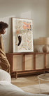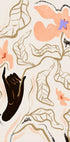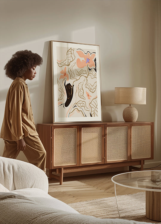 Nowoczesna abstrakcyjna grafika z ręcznie rysowanymi kwiatami w ciepłych odcieniach brzoskwini i moreli. Figuratywna czarna dłoń tworzy kontrast i głębię oraz tworzy poetyckie połączenie człowieka z naturą. Ten wyrazisty motyw botaniczny łączy w sobie nowoczesny styl country z artystycznym minimalizmem, idealny jako dekoracja ścienna.