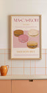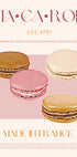 Francuski plakat z makaronikami przedstawiający kolorowe ciasta na bazie bezy, podkreślający ich pochodzenie i założenie w 1959 roku. Projekt podkreśla tradycyjne wypieki, żywe kolory i francuską sztukę cukierniczą.