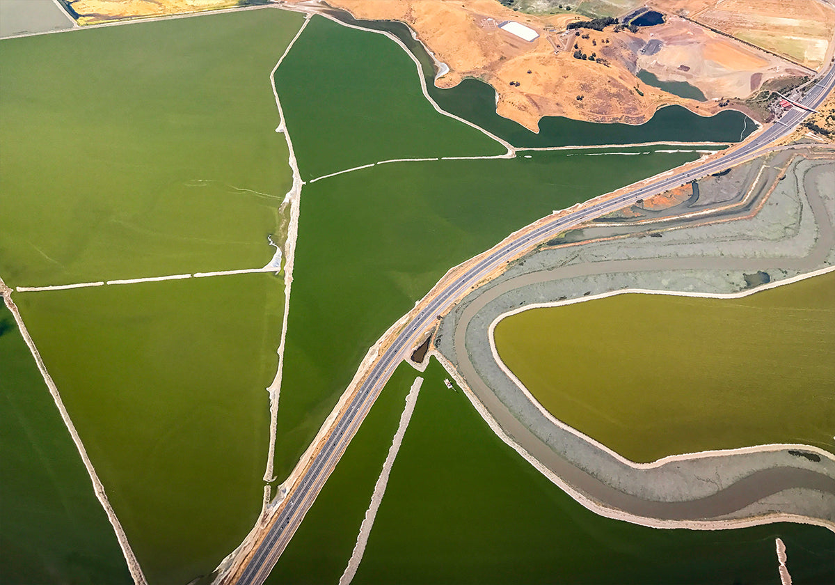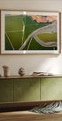 Oszałamiające zdjęcie lotnicze krajobrazu Zatoki San Francisco, gdzie kręte drogi, strumienie i zielone pola tworzą wyraźne wzory geometryczne. To dzieło sztuki, uchwycone z góry, podkreśla piękno granic natury i stworzonych przez człowieka, czyniąc je nowoczesną fotograficzną sztuką ścienną.