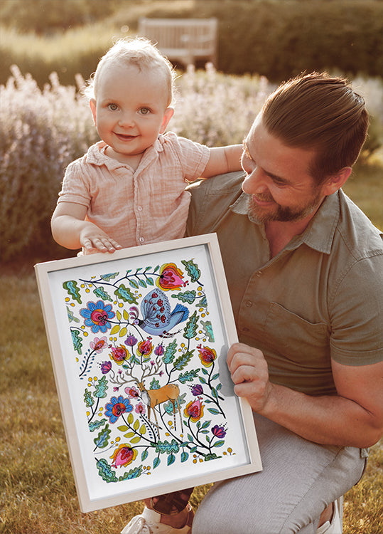 Plakat Il Etait Une Fois (po francusku „Pewnego razu”) to pobudzające wyobraźnię i czarujące dzieło sztuki, które przenosi widza do magicznego, baśniowego świata. Pełen wdzięku jeleń z kwitnącymi rogami stoi wśród żywych kwiatów, a po scenie przemyka pięknie wzorzysty niebieski ptak. Bogate w szczegóły i wypełnione żywymi kolorami – różowym, żółtym, niebieskim i zielonym – ta praca emanuje radością i zachwytem. Idealny do pokoju dziecięcego, kreatywnego studia lub innej przestrzeni, która celebruje wyobraźnię i naturę, pobudza wyobraźnię swoim zabawnym urokiem inspirowanym bajkami.