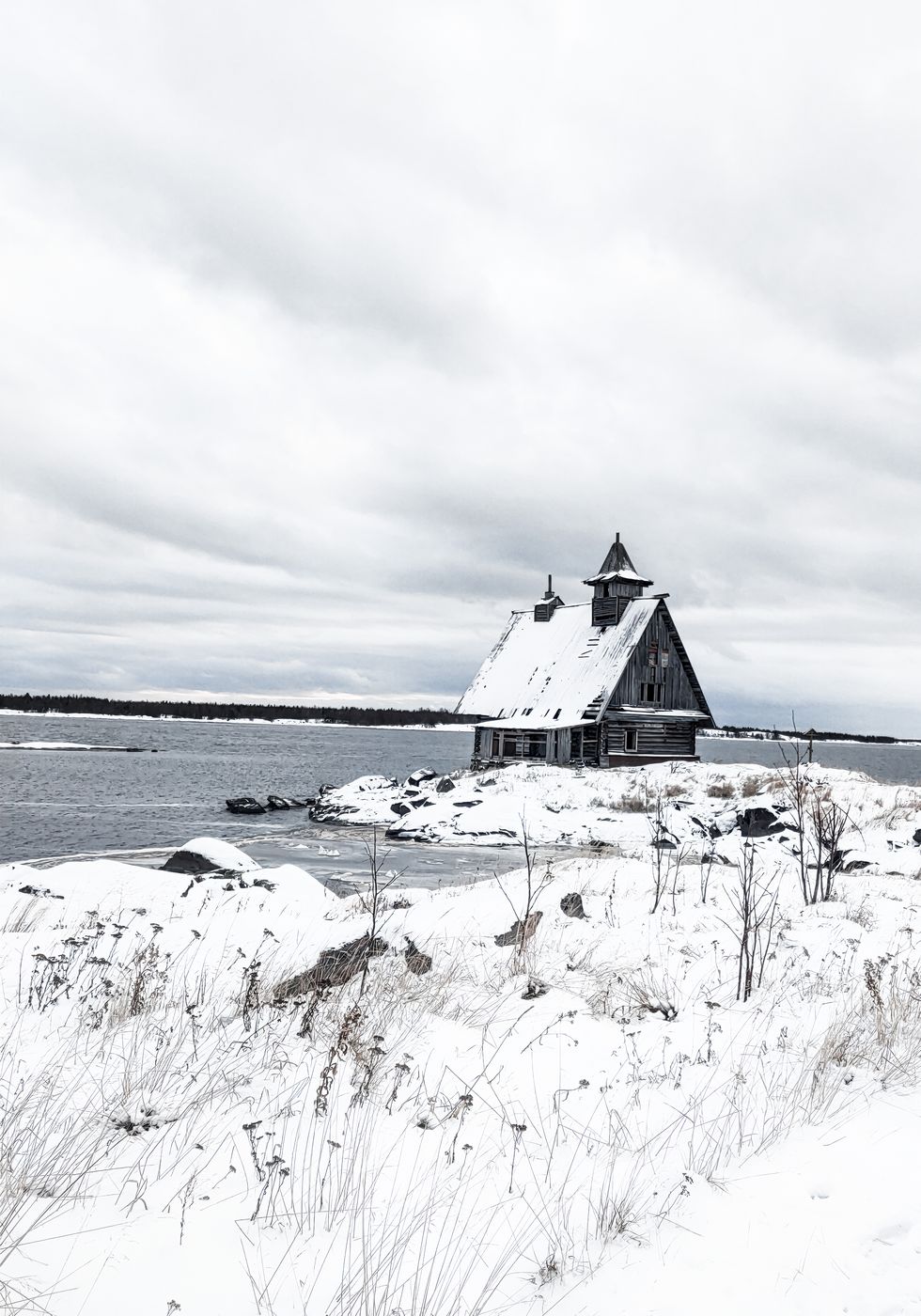 Sugestywne zdjęcie opuszczonej drewnianej chaty stojącej samotnie nad zamarzniętym jeziorem, otoczonej spokojnym, śnieżnym krajobrazem. Stonowane kolory i otwarte niebo tworzą wrażenie samotności, tajemniczości i surowego piękna nietkniętej dzikiej przyrody. Idealny dla miłośników nordyckiej estetyki, minimalizmu i zimowych krajobrazów.